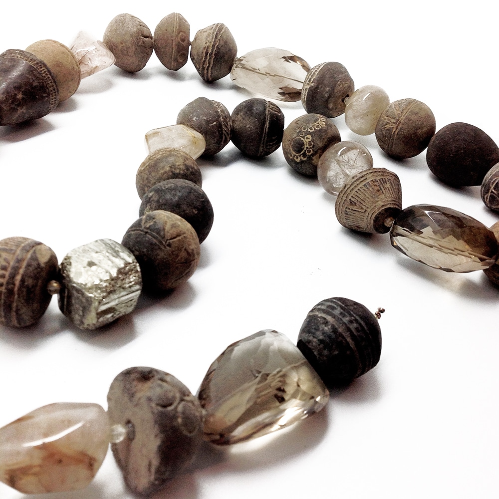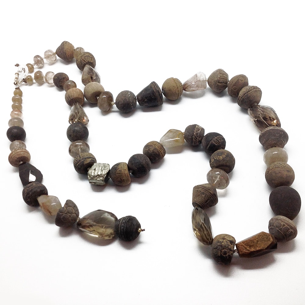 Collier Sautoir Piece Unique: Terre Cuite anciennne, Quartz fumé, Pyrite, Agate, Quartz rutile…