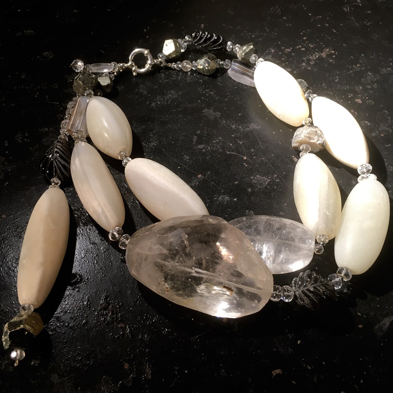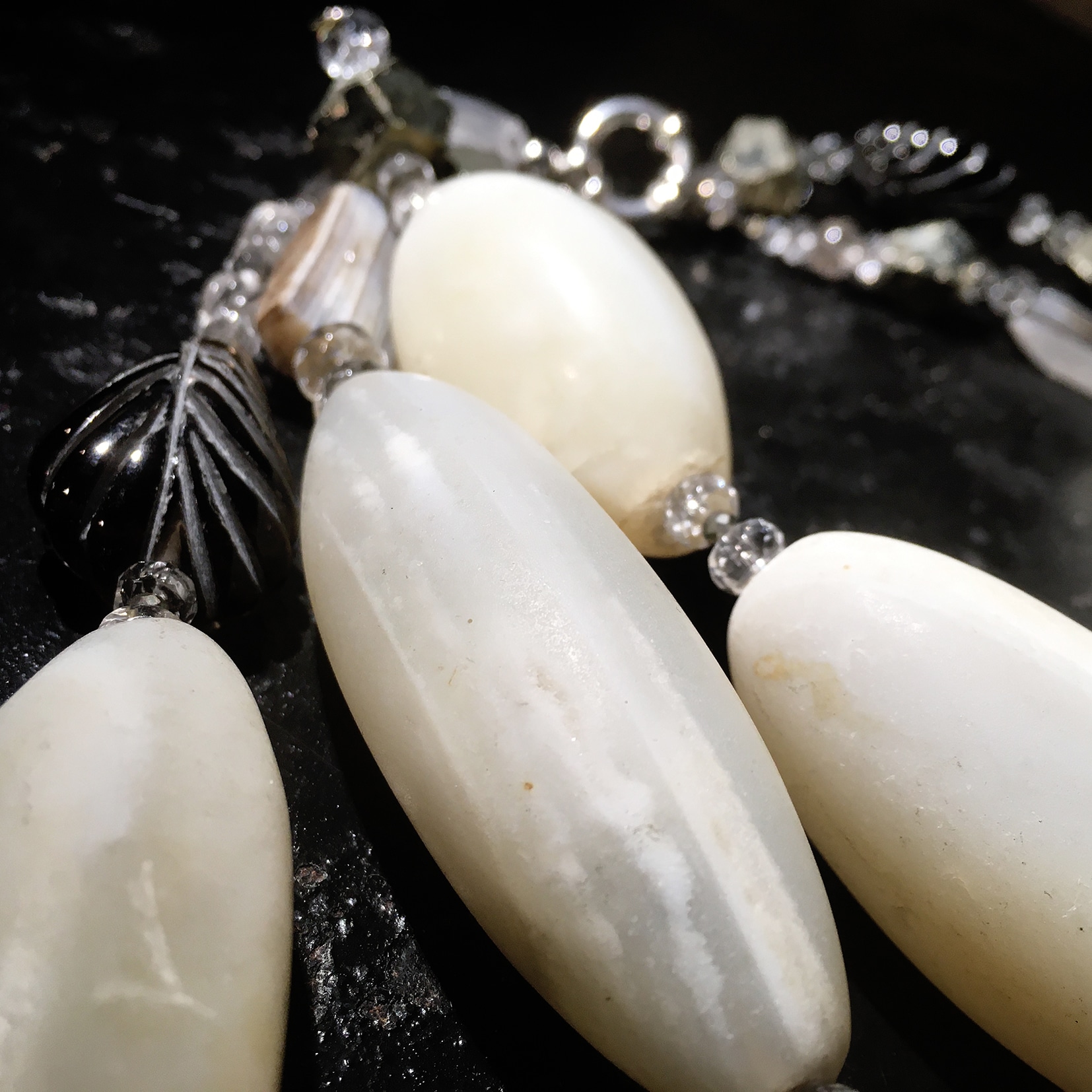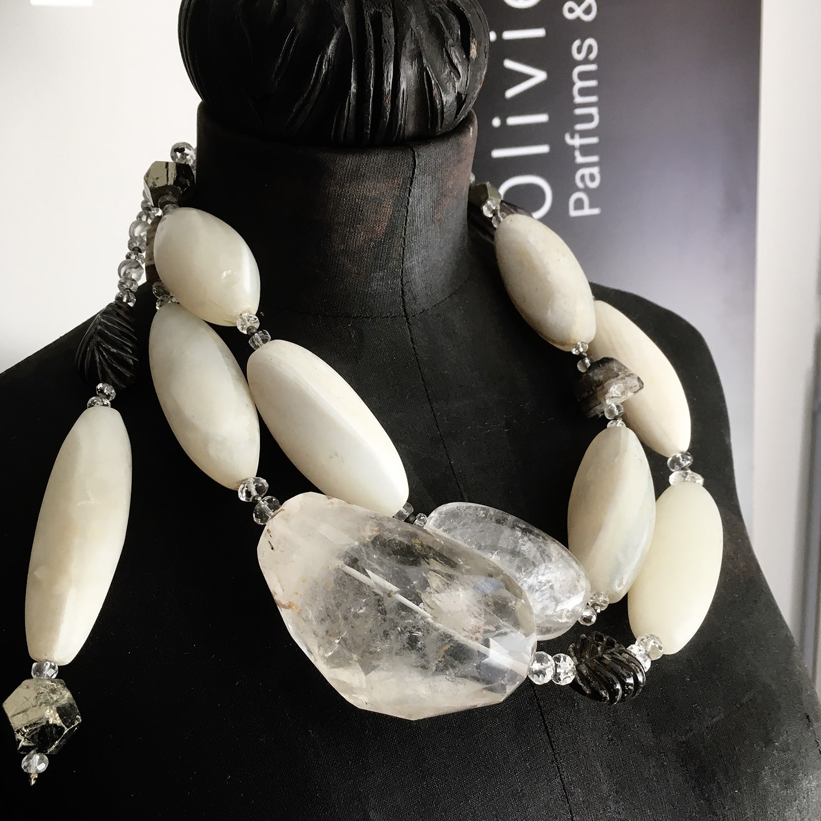 Collier Pierres Véritables – Piece Unique « Pure Rock » Anciennes agates blanches, pyrite, cristal de roche