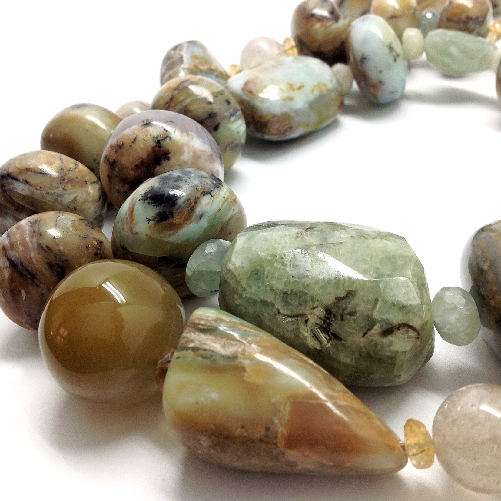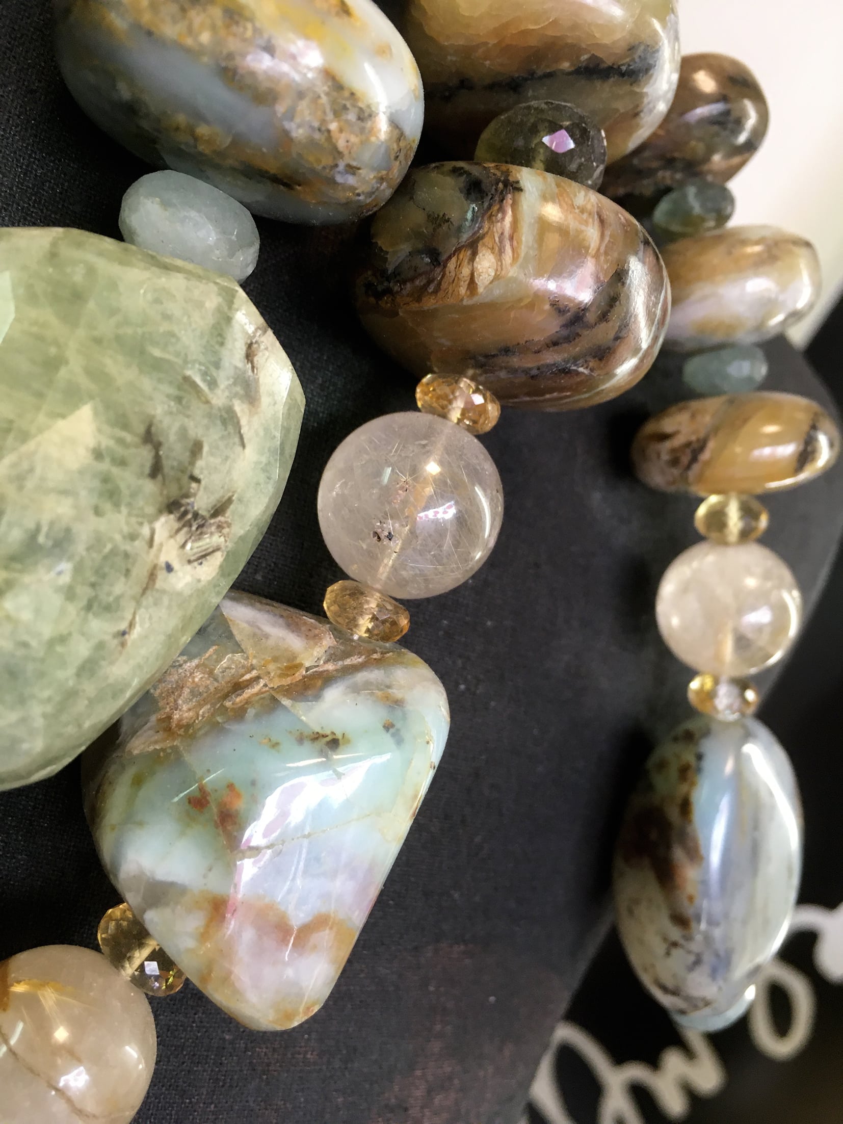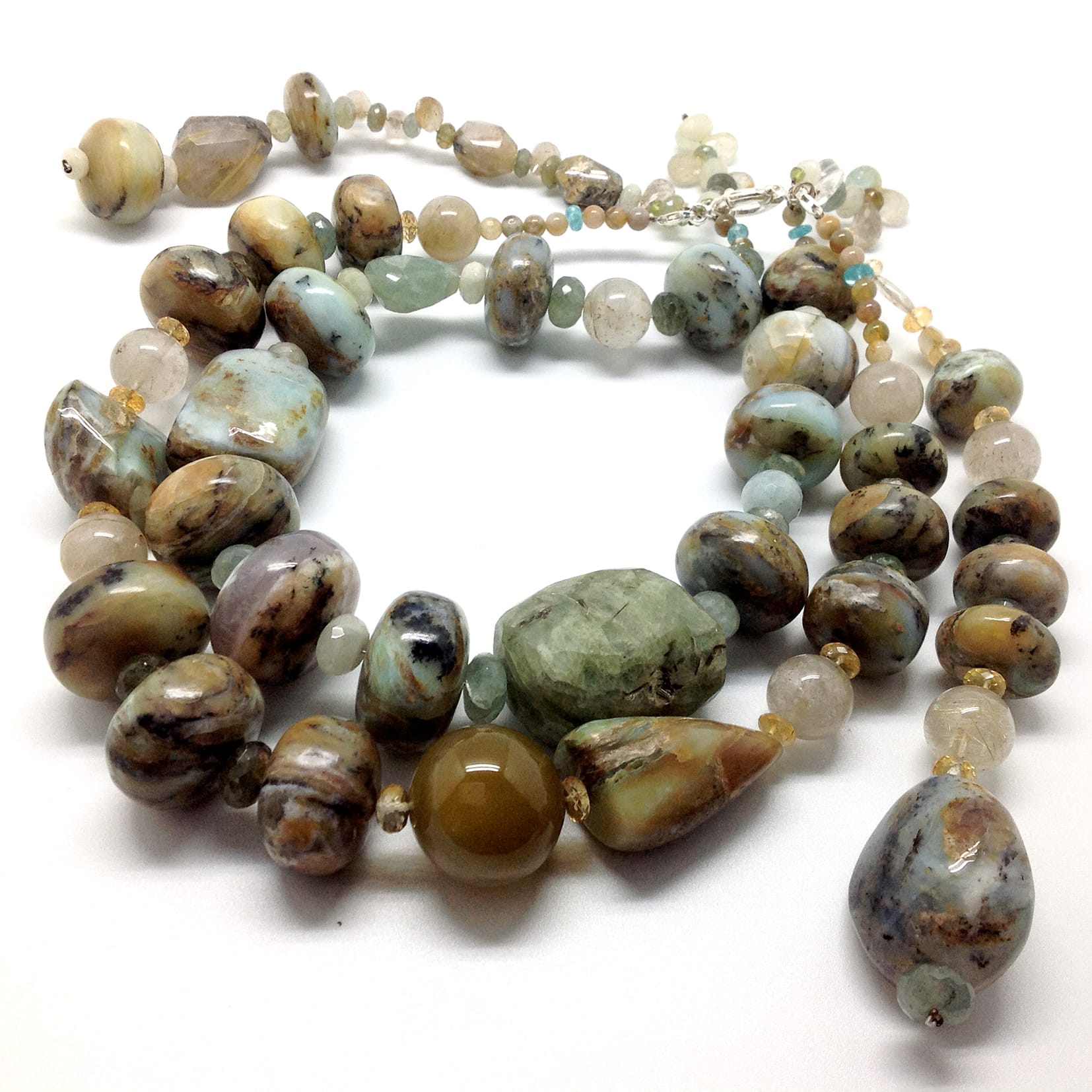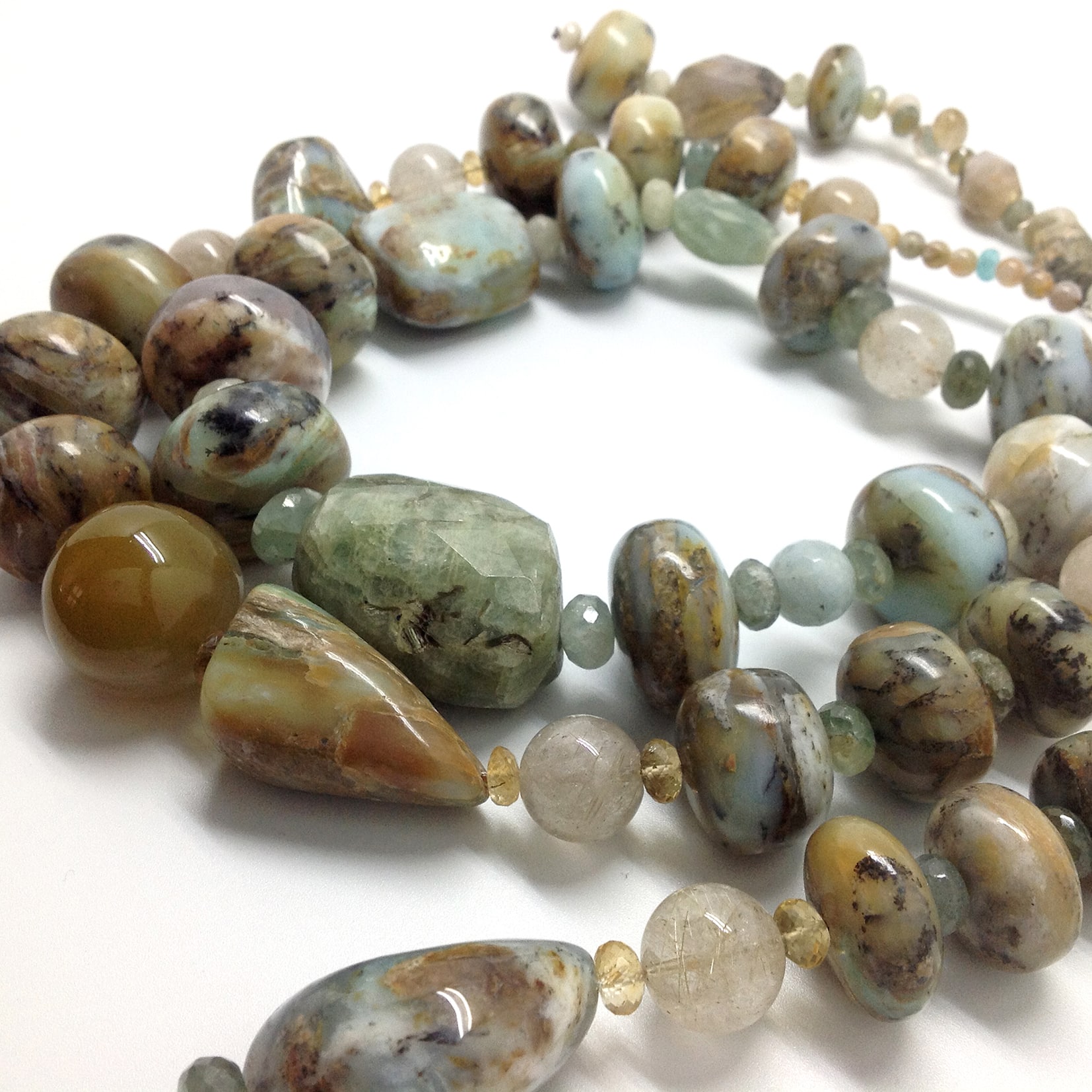 Roche d’écume – Collier Pièce Unique, opale commune brute multicolore, aigue marine, quartz rutile